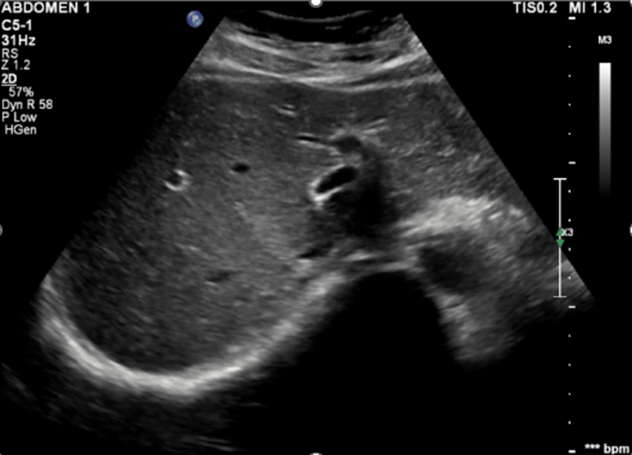 45세 여자가 간기능 이상으로 내원하였습니다. 음주력과 건강식품 복용력은 없었습니다. 혈액검사와 복부 초음파 소견은 아래와 같았습니다. [그림 1]