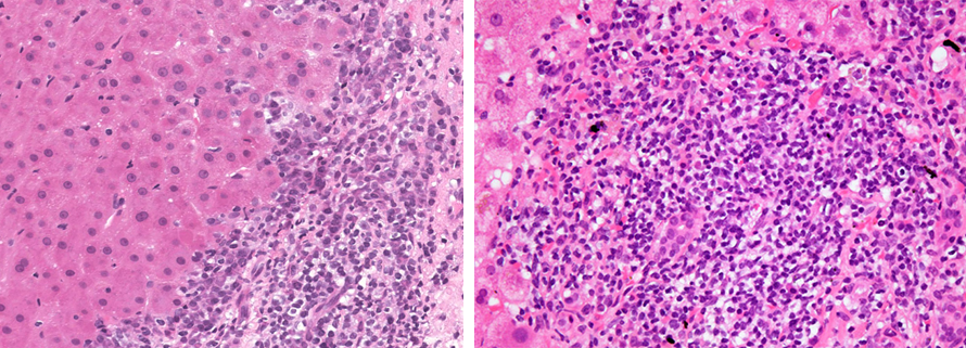 Interface hepatitis, portal inflammation, and scattered plasma cells