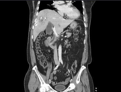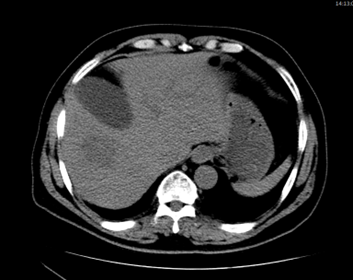 환자의 임상 증세를 고려하였을 때 화농성 간농양(pyogenic liver abscess)으로 판단되었으며, 경피적 배액술과 경험적 항생제 (3세대 세팔로스포린계열) 치료를 시작하였다. 이후 임상 경과는 점진적으로 호전되었으나, 추적검사로 상태 안정된 후 조영제를 사용한 역동정 조영증강 CT 검사에서 총담관 확장 소견이 동반되어 [그림3] 추가적인 원인 평가를 시행하였다.