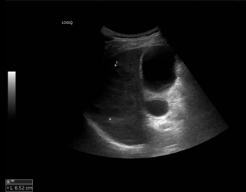[그림 2] 간우엽에 6.5cm의 저에코성 병변