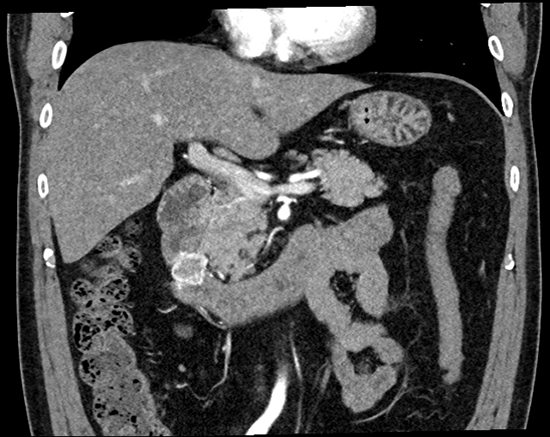 [그림2] 복부 전산화단층촬영상 십이지장 제2부의 조영증강이 잘 되는 종괴가 관찰됨.